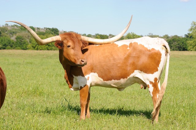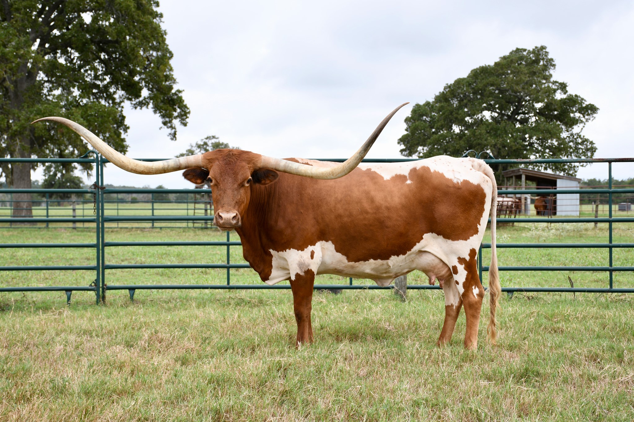 Long, deep bodied with 97 inches of rolling tip tip horn. She is one of our top foundation Longhorn cows. Just an incredible producer.